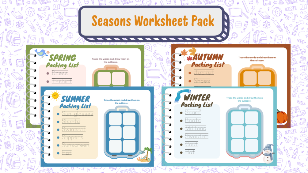 This printable set includes four landscape worksheets — one for each season — where kids trace words related to packing a suitcase for spring, summer, autumn, and winter. Perfect for classroom use, homeschooling, or educational travel-themed activities.